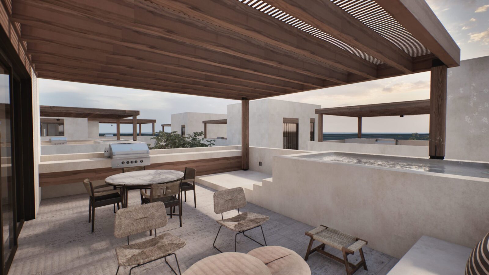 One of the highlights of each house is the rooftop garden, where residents can unwind and immerse themselves in the tropical ambiance of Tulum. Here, a Jacuzzi beckons, inviting relaxation and rejuvenation, while a private pool provides a refreshing oasis in the midst of the verdant beauty. The rooftop gardens not only serve as private retreats but also offer panoramic vistas of Tulum, creating a truly unique and enchanting experience.